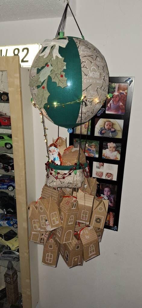 Der Heißluftballon hängt sehr schön an Vorhangstangen, Wendeltreppen oder Blumen- bzw. Deckenhaken. 24 kleine Geschenke finden ihren Platz an den Halteschlaufen am oder im Körbchen selbst. Eine Vorlage mit neutraler, grauer Zahlenbeschriftung zum Ausdrucken ist inklusive.